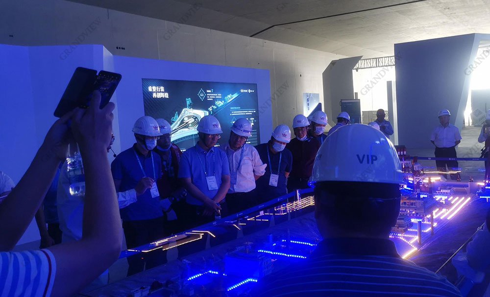 展會現場深藍色基調主題鮮明,設計展板分區明確、LED影視播放結合音效環繞、沙盤模型立體動態展示、現場布置氛圍烘托到位,光影交織中,影音交匯間,深中百年品質工程技術與精神的深度融合盡收眼底。