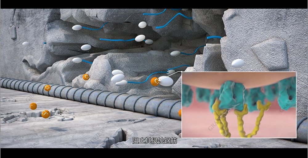 鏡頭再次遞進,進入分子結構層,AE標注畫面清晰。窺探式的鏡頭,通過形象的動畫,將阻銹劑擬人化,探針奮力游向有害元素并結合的過程以動畫展示,真實的質感與色彩,這一切都仿佛有了生命,超敏智能防腐新材料也賦予工程新生命。